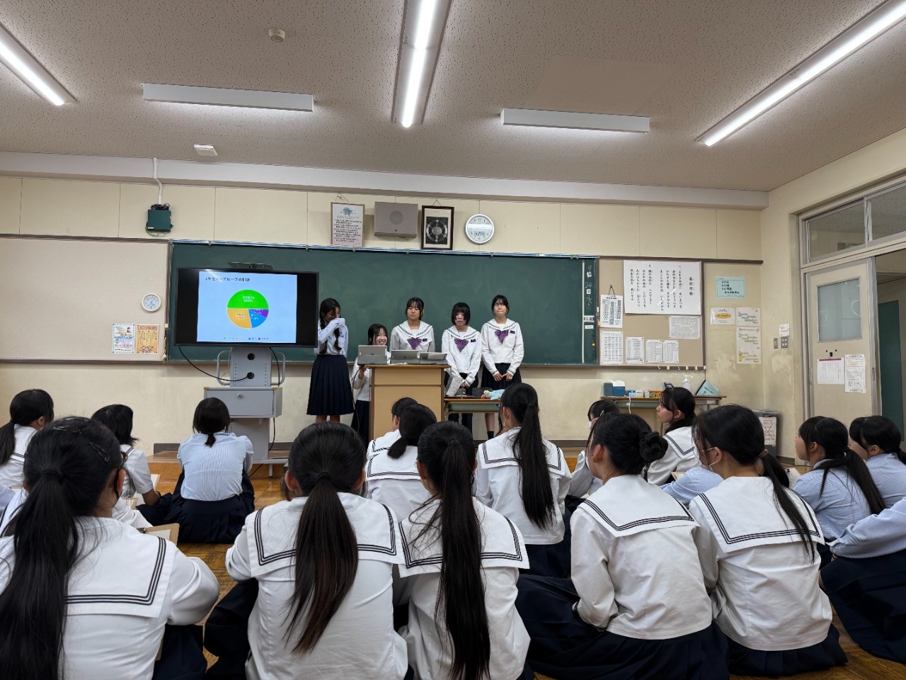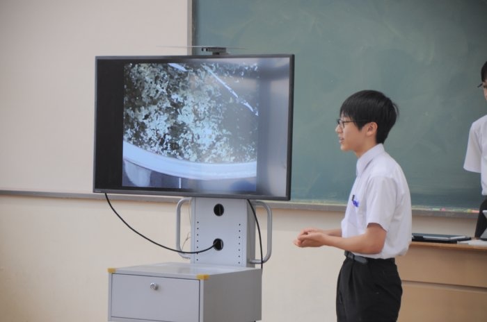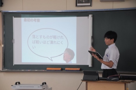 9月24日の5限目の時間に、3年生による課題探究の発表会が開かれました。これは3年生が4月から7グループに分かれて、独自のテーマで探究を進めてきたものです。どのグループもテーマがユニークで、興味関心を持つものばかりでした。一部のグループでは実験で使用した道具を披露し、1,2年生に体験させるコーナーもありました。グループでの探究活動は今回が最後でしたが、探究しきれていないこともたくさんあると思います。特に実験は条件を変えることで結果も大きく変化するので、非常にやりがいを感じます。ここまでの活動で見出された結果に満足することなく、今後も深く探究し続けてほしいと思います。