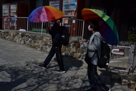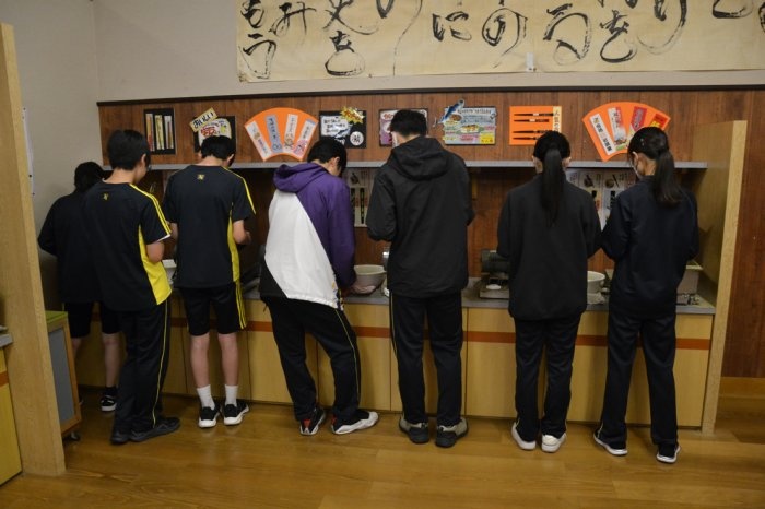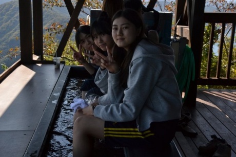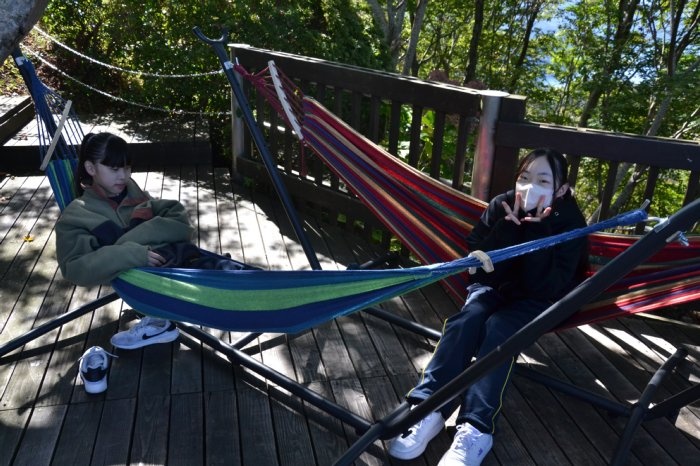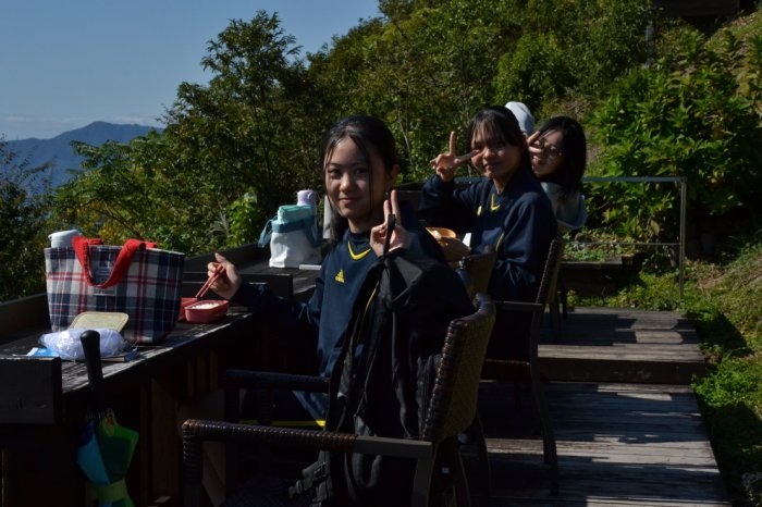 午前中は美浜町のレインボーラインを訪れ、山頂で2時間ほど食事や観光を楽しみました。幸いにも当日は天候に恵まれ、周辺の絶景を遠くまで見渡すことができました。また、ハンモックや足湯のコーナーは大好評で、多くの生徒が団らんになって癒されていました。