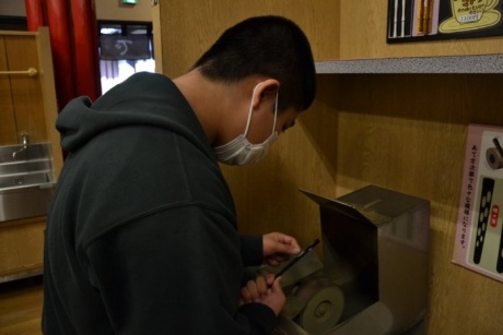 午後は小浜市の「箸匠せいわ」で箸の研ぎ出し体験をしました。体験の前に、箸に関する講座を聞き、箸の使い方のマナーや研磨の技術を学びました。一般的に知られていない箸の使い方を多くの生徒が精通しており、お店の方も驚かれていました。一方で研ぎ出し体験では、力加減が上手くいかず苦戦する様子が伺えましたが、終始真剣な表情で作業に取り組んでいました。普段の芸術の授業では学べない新しい技術を習得することができました。