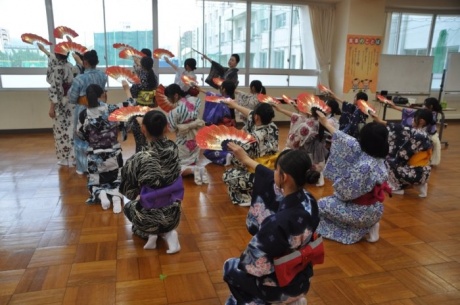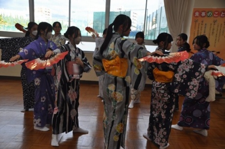 さらに、男子は法被(はっぴ)、女子は浴衣を身につけ、伝統的な衣装で踊りの練習に取り組みました。この衣装を着ることで、舞踊だけでなく日本の伝統文化そのものを体感する機会となり、生徒たちはより深い理解を得ることができました。