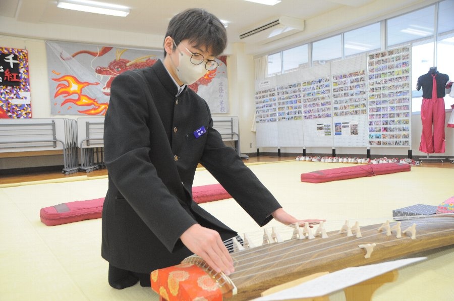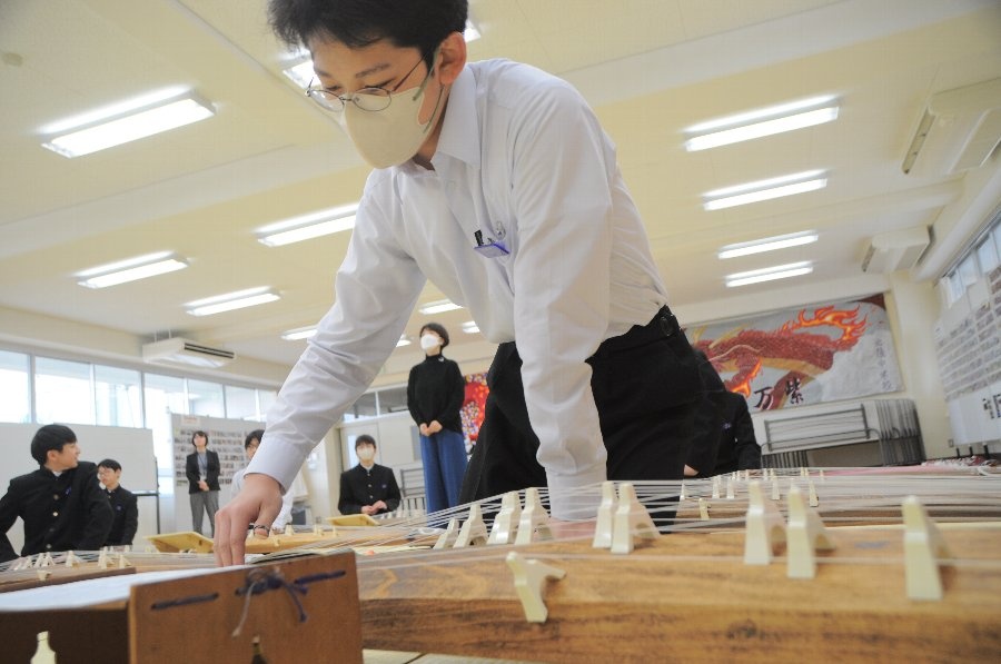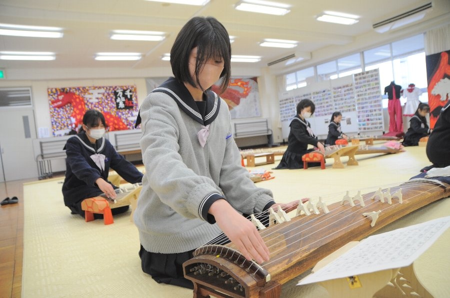 一方、琴の体験では、小学生の頃に授業等で触れたことのある生徒も多く、講師の先生の話をよく聞きながら、指の使い方や音の響きを確かめつつ演奏に取り組みました。全体で「さくら」を演奏した際には、教室いっぱいに美しい音色が響き、生徒たちは邦楽の魅力を存分に味わうことができました。