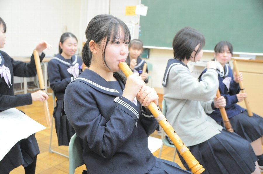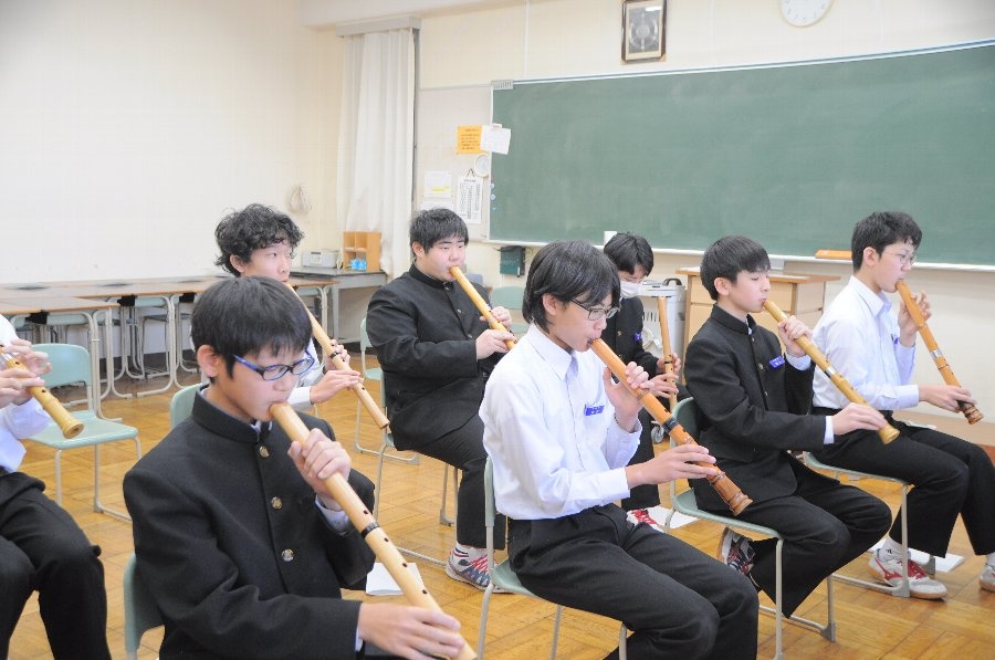 はじめに体験した尺八では、音を出すこと自体が難しく、息を入れる角度や息のスピードを少し変えるだけで音の出方が大きく変化するため、多くの生徒が苦戦していました。何度も試行錯誤を重ねる中で、少しずつ音が鳴るようになり、尺八の奥深さや演奏の難しさを実感する姿が見られました。