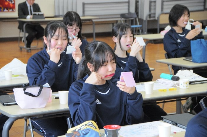 講座では、歯の染め出しを行い、磨き残しを実際に確認しながら、日頃の歯みがき習慣を見直しました。生徒たちは自分の歯の状態を目で見て確かめることで、正しい歯みがきの大切さを実感している様子でした。