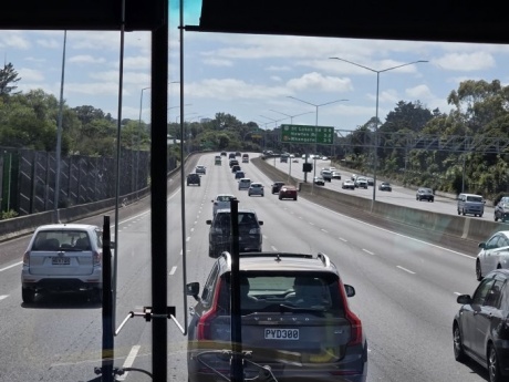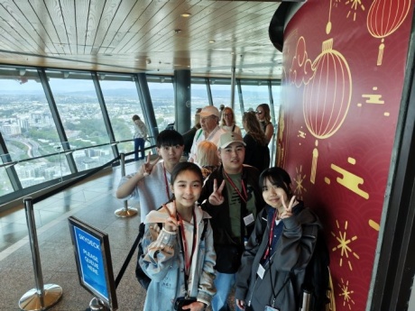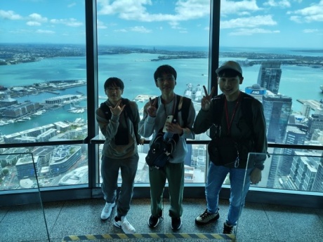 オークランド空港からは大型バスで移動しました。研修地のタイルアへ行く前に、オークランド市街地を訪れ、全員でスカイタワーに上りました。