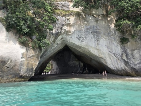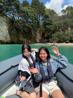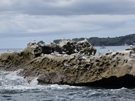 さて、今日はとあるホームステイ先のアクティビティに同行しました。タイルアは海沿いにある小さな町で、ボートやカヌーなどの体験ができます。今回はタイルアから専用のボートでコロマンデル半島方面に行ってきました。多くの島々を巡りながら、ツアーガイドの方から、自然の歴史や生物の話などを聞きました。一押しのスポットはカセドラル・コーブです。この付近は海底がとてもきれいで、海水浴も楽しめます。今日も晴天に恵まれ、多くの観光客が海水浴やマリンスポーツを楽しんでいました。26期生の中にも、今日海水浴に行った人がいるそうです。残念ながらツアー中に泳ぐことはできませんでしたが、ニュージーランドならではの自然景観を間近で眺める良い機会になりました。