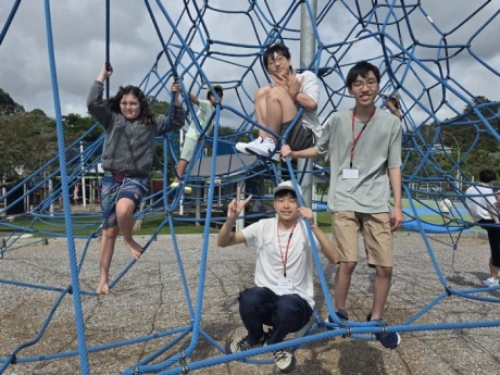 その後の休憩時間には、屋外で現地の小学生と楽しく触れ合いました。初日にもかかわらず、既に現地の小学生と打ち解けあっていて、バスケや遊具で遊んでいる姿が見られました。