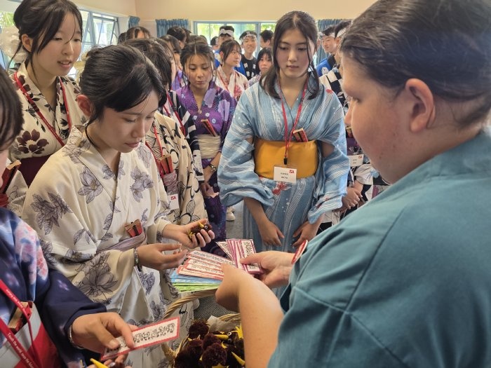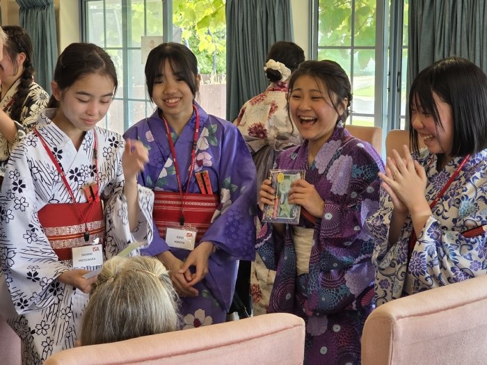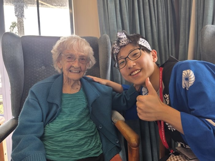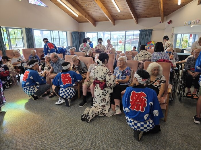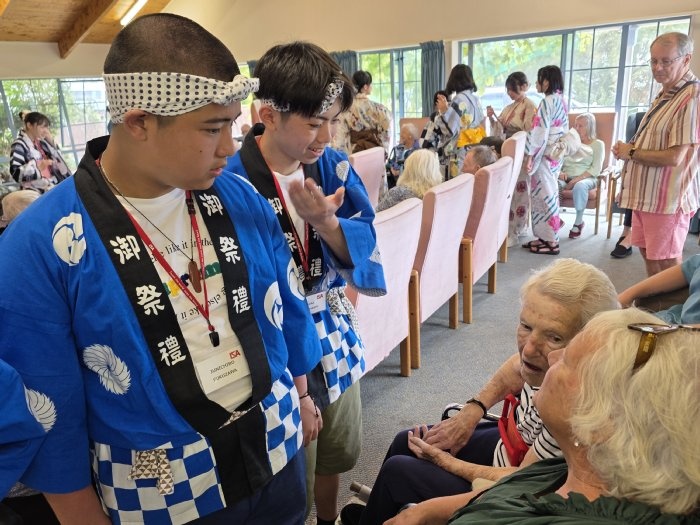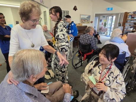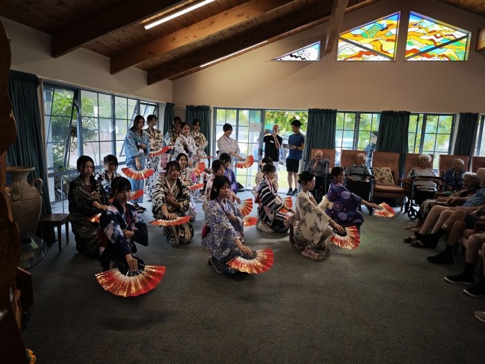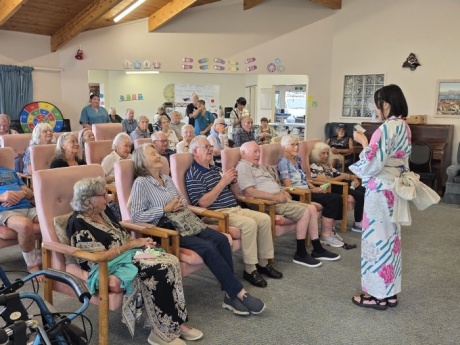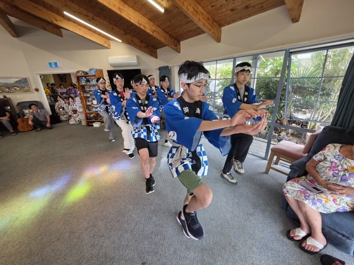 12日午前中、26期生一行はタイルア学校の近くにある老人ホーム「Tairua Residential Care」を訪問しました。お年寄りの方が集う前で、渡航前に練習してきた日本舞踊や合唱曲を披露し、交流の時間には、会話や遊びを通して楽しくふれ合いました。