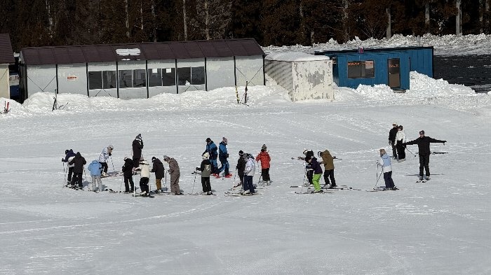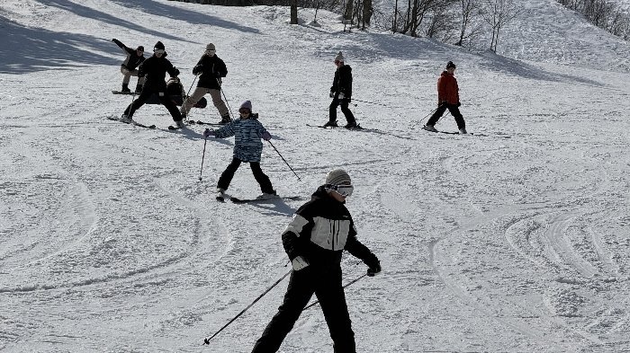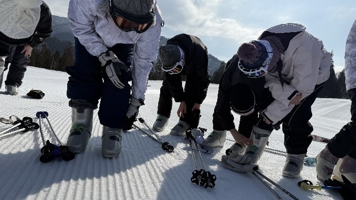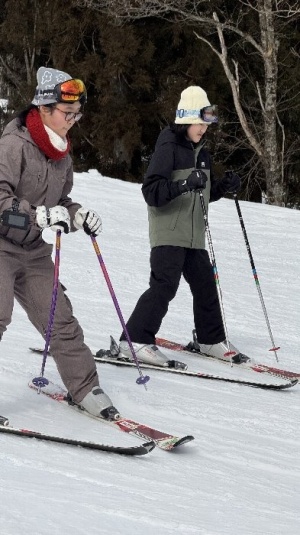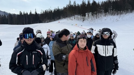未経験者や初心者が多い中、8つのグループに分かれて教員とインストラクターの方に指導していただきました。上~中級者の班は朝からリフトで上がり、先生方の指導で滑っていきました。一方、未経験者や初心者はふもとの初心者コースで歩く登る止まる曲がるの練習をしました。だんだんと慣れてきた生徒は午後からリフトに乗って滑走を楽しみました。