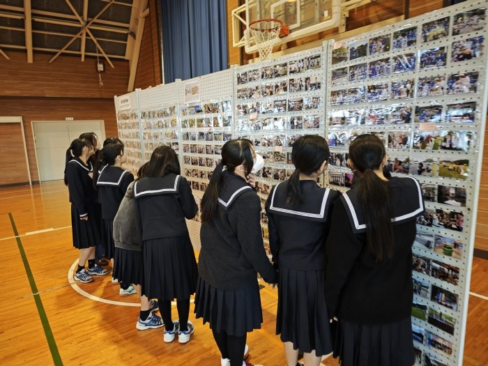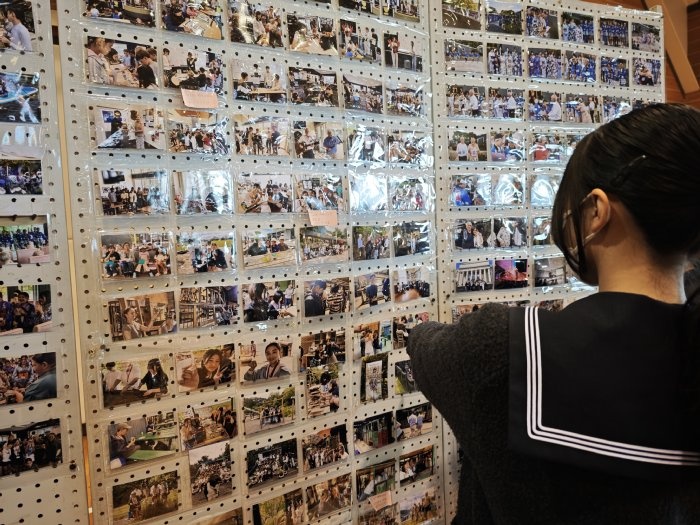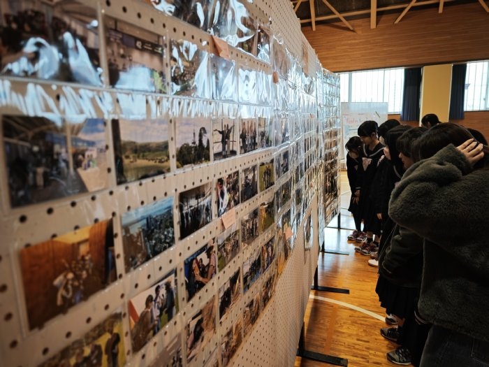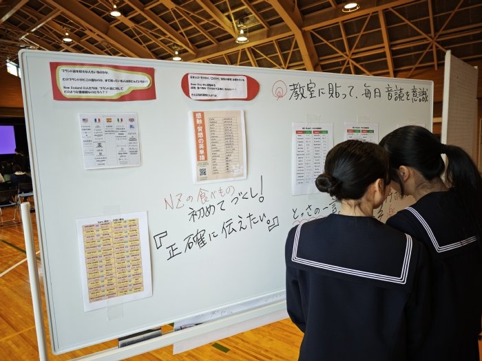 そして休み時間には、多くの生徒が、展示されたNZ語学研修の写真を眺めていました。特に、1,2年生は来年以降にNZ語学研修が控えており、それを楽しみにしながら眺めている様子が印象的でした。