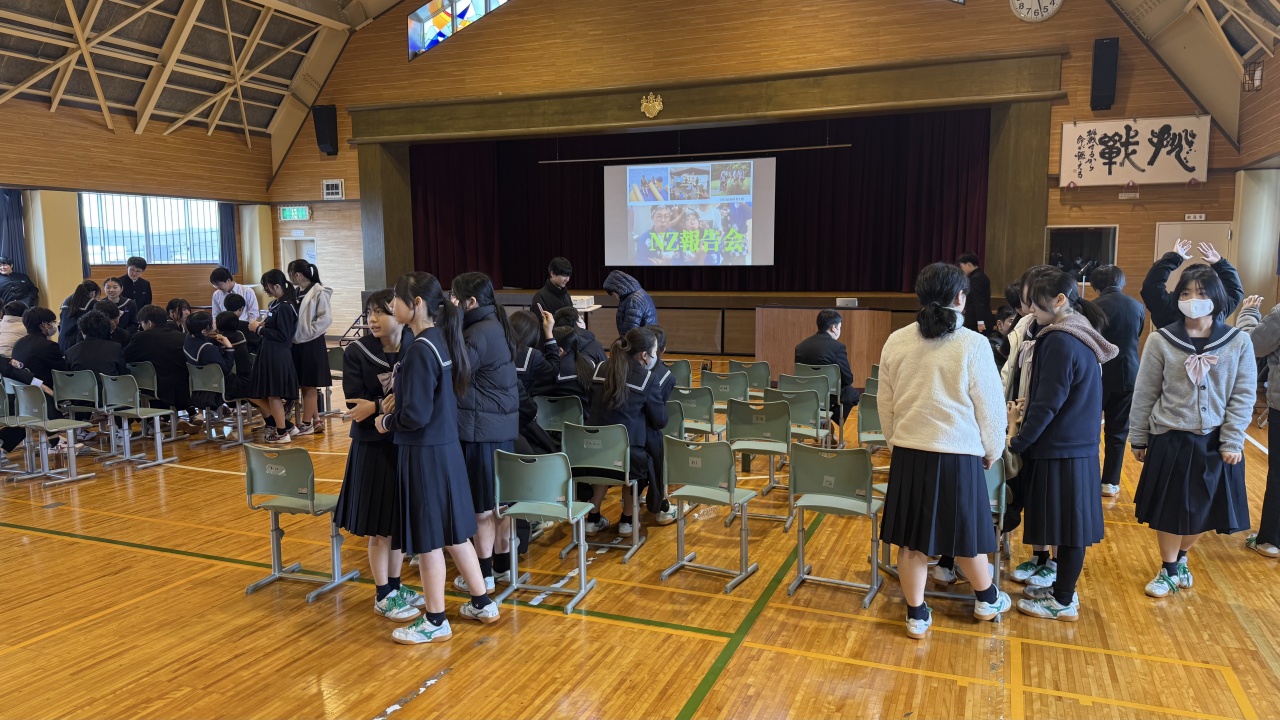 3月5日、3年生(26期生)によるNZ(ニュージーランド)語学研修報告会が行われました。NZから帰国して早くも2週間が経ちましたが、現地での生活を懐かしく思い出しながら、後輩や保護者の方がいる前で、生き生きとした表情で発表することができました。