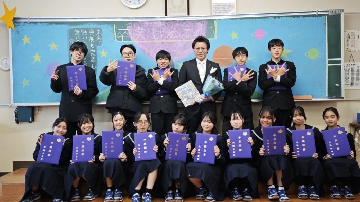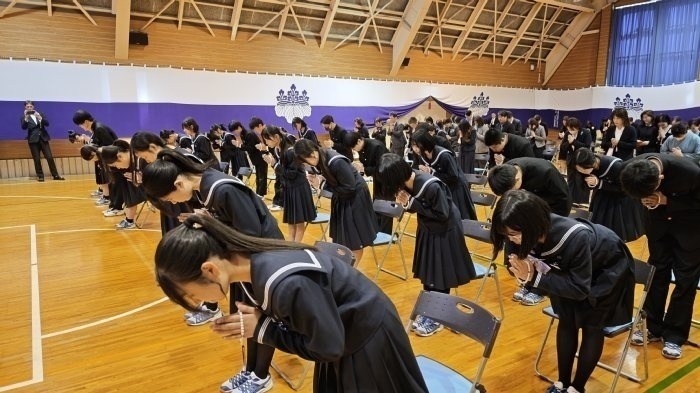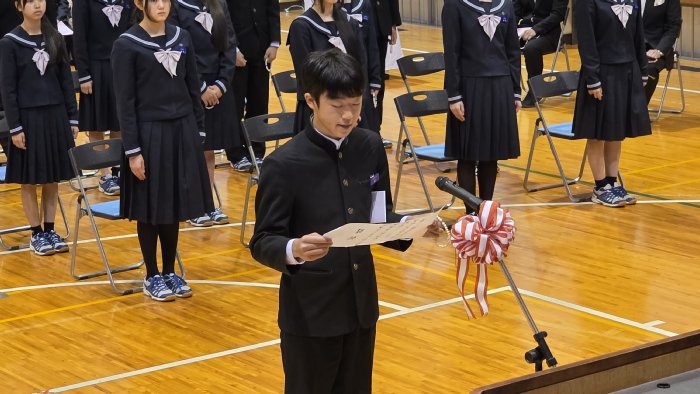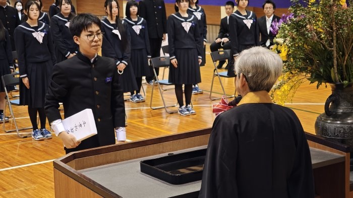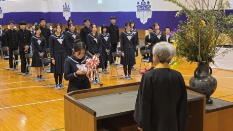 三年生を送る会を終えた翌日3月12日、遂に3年生が卒業の日を迎えました。三年生を送る会では色んな感情を見せてくれた3年生も、この日は凛とした表情で式典に臨み、先生方や保護者が見守る中で、一人ずつ卒業証書を受け取りました。