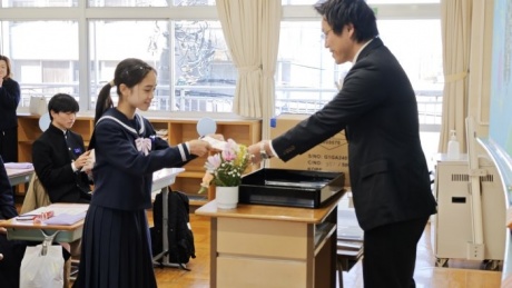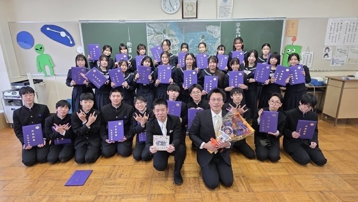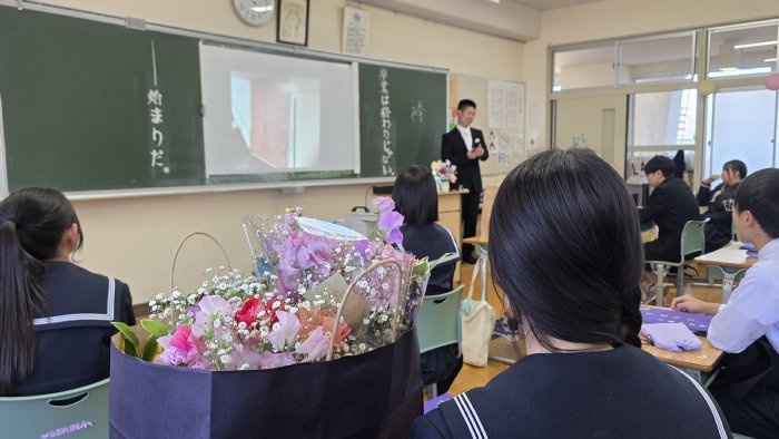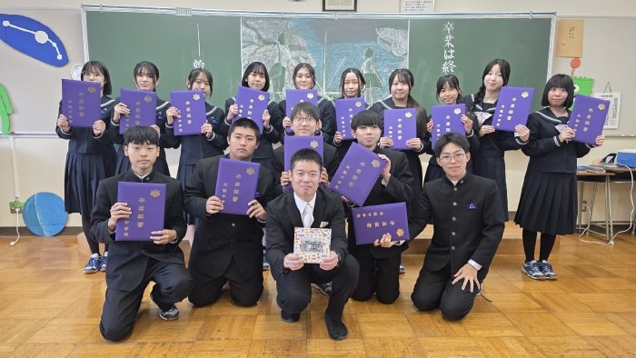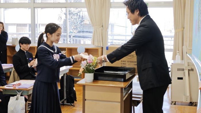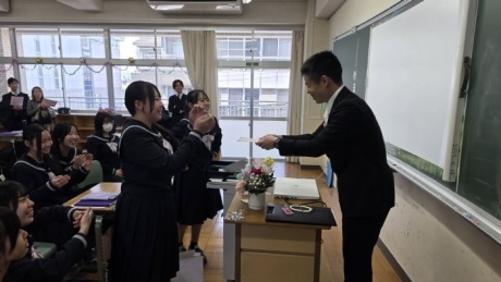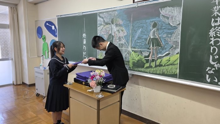 式典の後は、各クラスで最後のロングホームが行われ、担任団が作成した思い出動画で3年間の思い出を振り返ったり、担任団と生徒それぞれが準備したプレゼントを交換したりして過ごしました。思い出動画では、入学当初からの映像を振り返って、こんな出来事があったなと思い返すシーンがたくさん見られました。1年生の時の幼い表情が、今となっては凛々しい姿に変化し、また一歩大人へと近づいたことに喜びも一入に感じています。卒業するに当たり、式典やクラス活動の最中に思わず涙を流す生徒も見られましたが、3年生らしく笑顔の絶えない最後の一日を過ごすことができました。