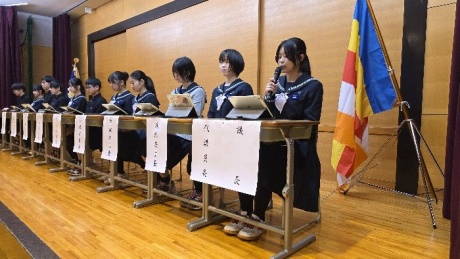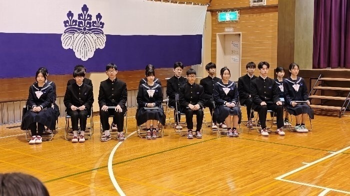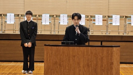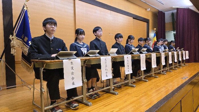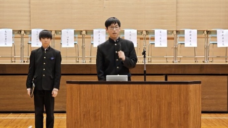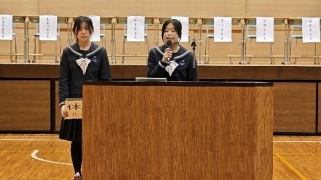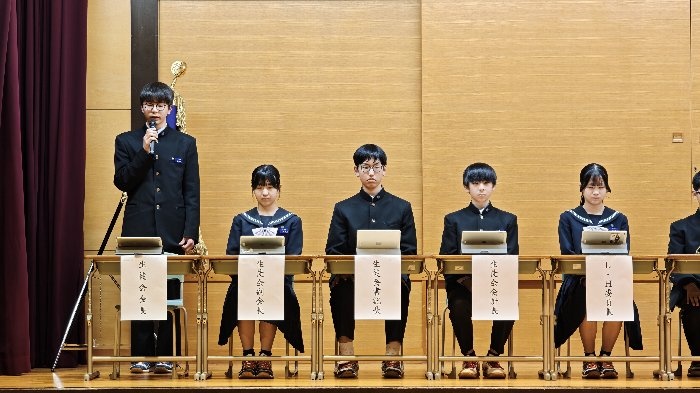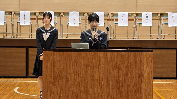 生徒総会では、生徒会四役の公約に関する達成報告や経過説明、また、各種委員会委員長より活動報告がなされました。特に今期の四役は校則改定に関する取り組みを積極的に行い、来年度から体操服での下校を認める運びとなりました。