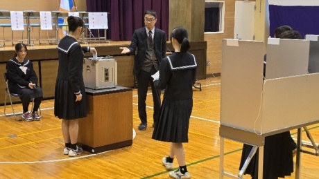 生徒総会のあとは、来年度前期の生徒会四役立候補者の立会演説会が行われ、推薦人と立候補者がそれぞれ熱く力強い演説を行いました。そして、福井市選挙管理委員会からお借りした本物の記入台と投票箱を使って投票が行われました。結果、会長立候補者3名中に2名が同得票となり、決選投票が行われました。